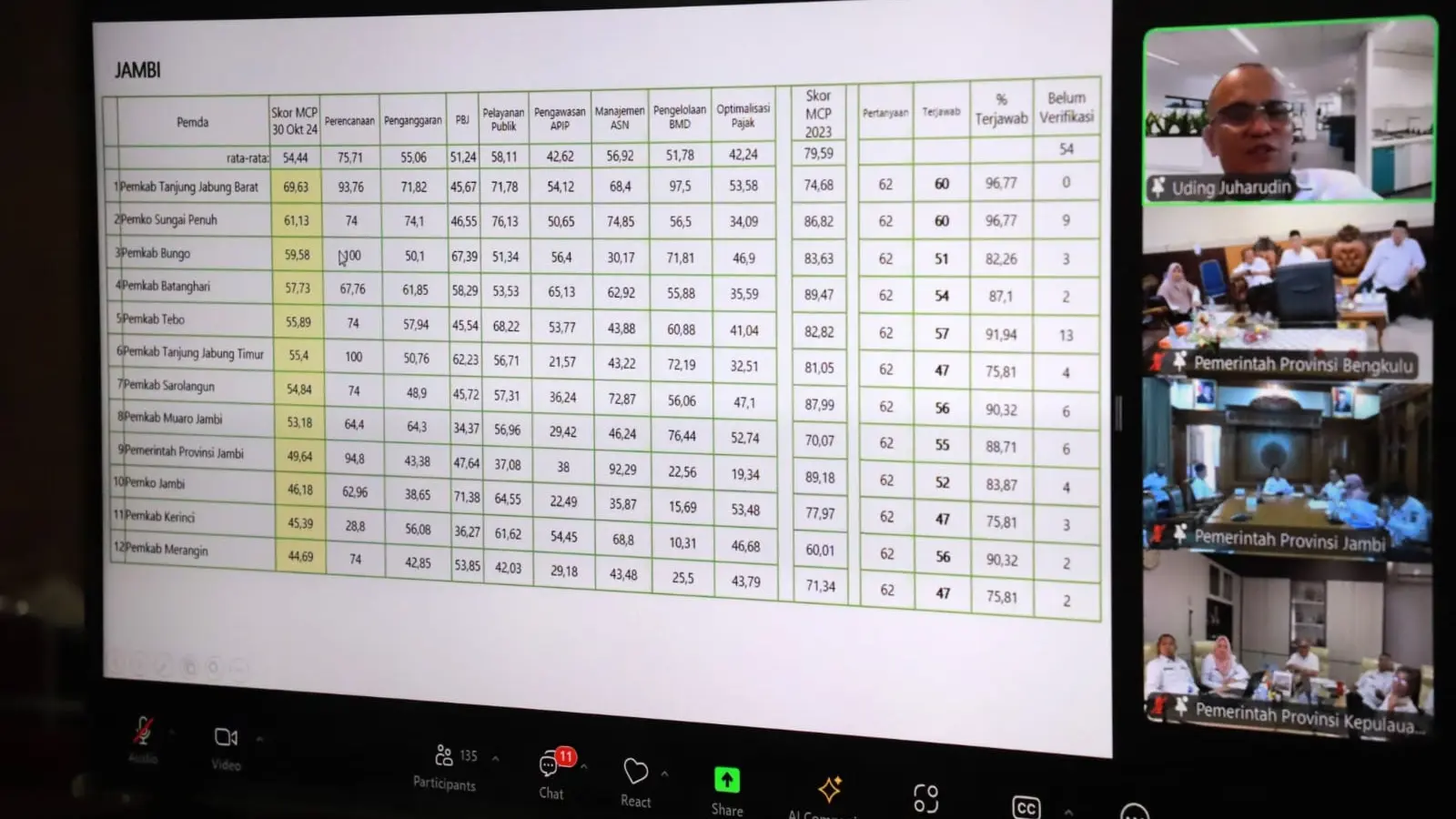 Rapat ini bertujuan untuk memantau pencapaian MCP Kabupaten Tanjung Jabung Barat dan memberikan arahan untuk meningkatkan efektivitas pencegahan korupsi di daerah. Dalam rapat tersebut, turut hadir Sekretaris Daerah Tanjung Jabung Barat, Kepala Dinas PTSP, Kepala Dinas Dukcapil, Kepala Dinas Kesehatan, Sekretaris Inspektorat, Sekretaris Dinas Pendidikan, serta perwakilan OPD terkait.