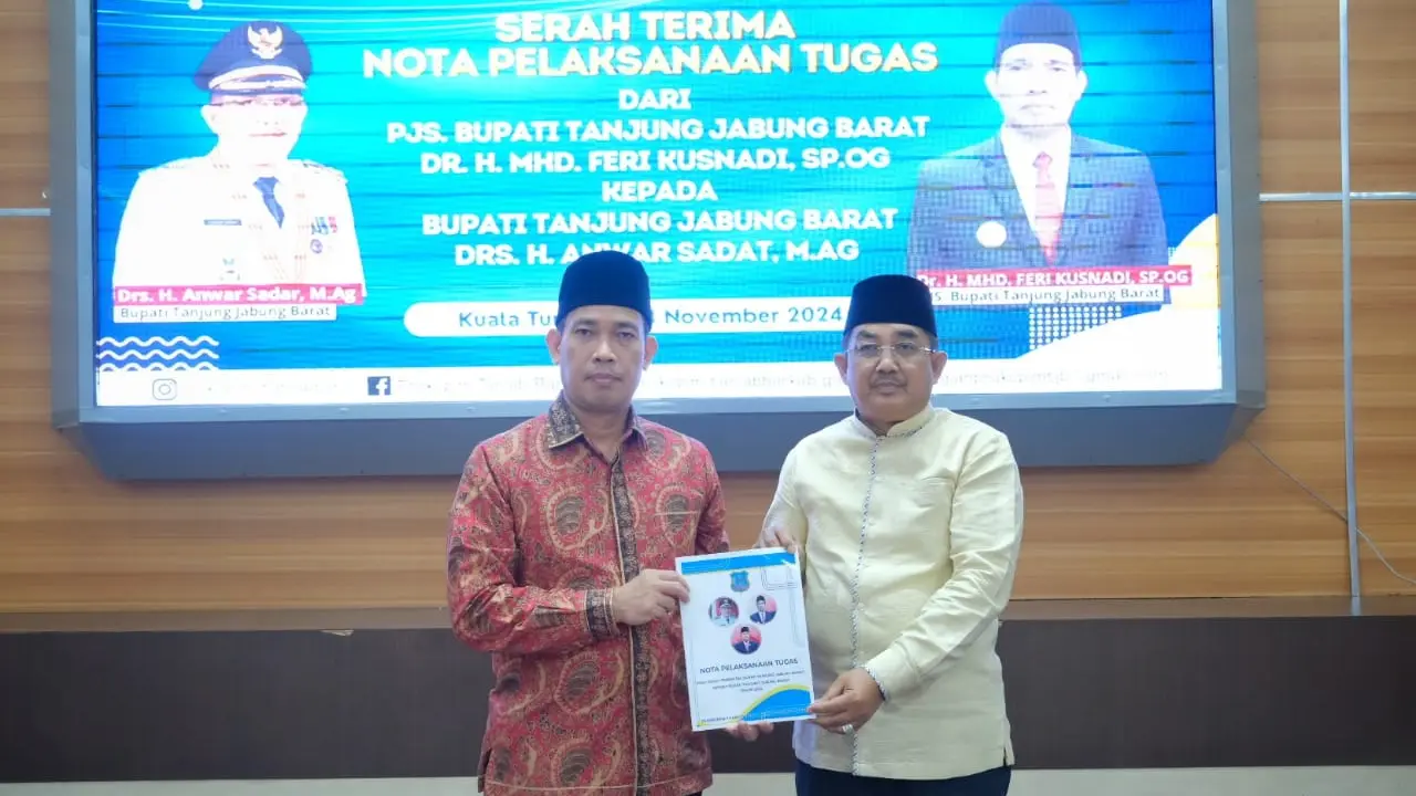 Pemerintah Kabupaten Tanjung Jabung Barat melaksanakan acara serah terima Nota Pelaksanaan Tugas dari Pjs. Bupati dr. H. MHD. Feri Kusnadi, SP, OG., MM kepada Bupati Drs. H. Anwar Sadat, M.Ag. Acara berlangsung di Aula Rumah Dinas Bupati. Minggu (24/11).